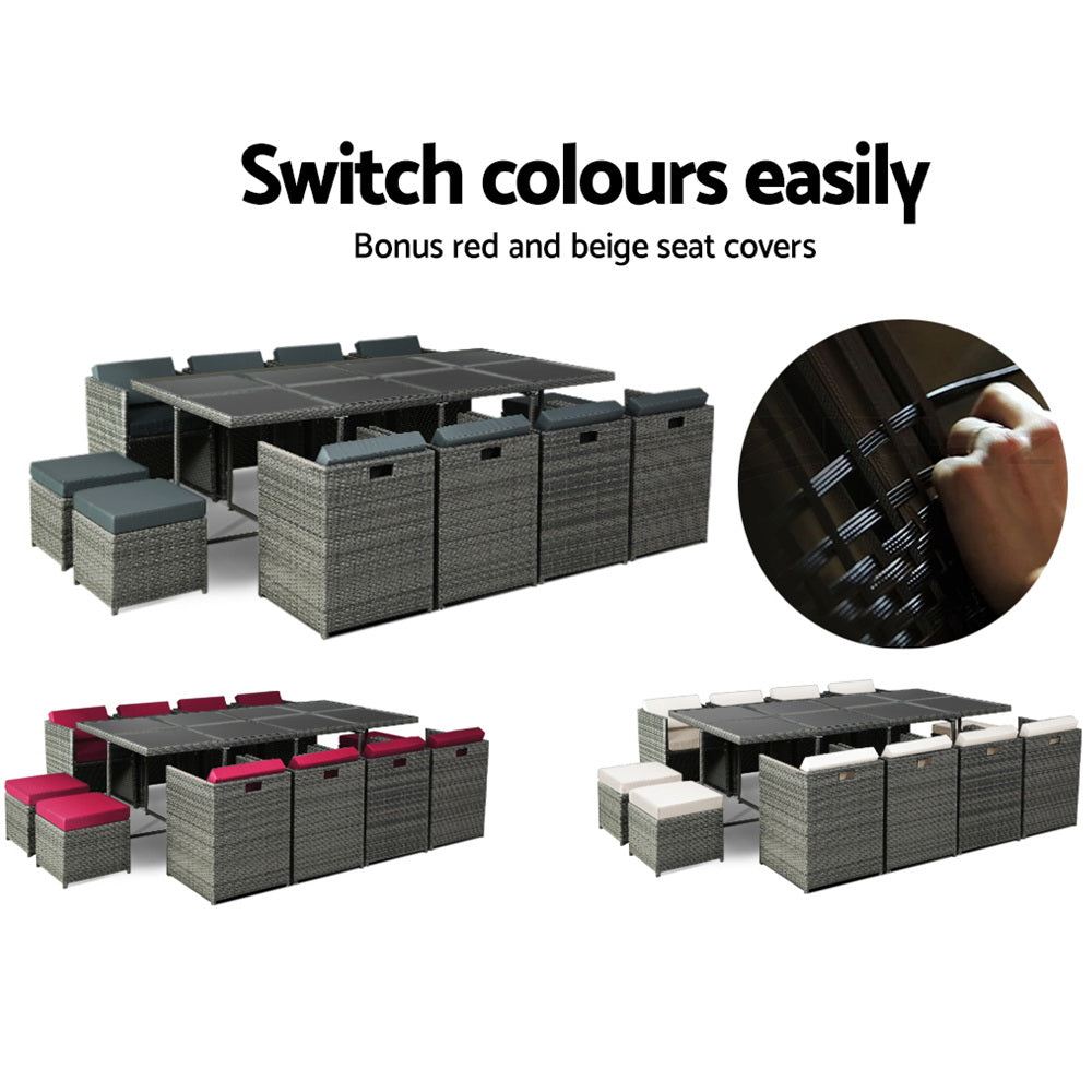 Looking to create a chic and gorgeous outdoor dining setting? The Gardeon 12-seater wicker outdoor dining set is a must purchase. It will liven up your outdoor space and help you achieve an elegant space where you can enjoy day and night and summer and winter. This 13-piece set comprises of eight chairs, four ottomans, and a large table. It boasts an integrated design that helps save space. The ottomans can be pushed under the chairs when not needed. All the seat and back cushions come with thick, high-density soft padding that ensures your comfort always. Additionally, the removable cushion covers are water-resistant to suit different seasons. Furthermore, our outdoor set features a lovely wicker weave for a touch of tropical charm, and the UV-resistant PE wicker with weather-resistant aluminium frame is suitable for all-season use. The large table with thick tempered glass top, durable frame, and stable cross construction ensures strength, durability, and stability. This set also comes with a bonus water-resistant storage cover that offer protection from all seasons. Our wicker outdoor dining set will withstand the test of time. You can create a praise-worthy spot with just a little creativity that will wow your guests. Shop it for your home today.
